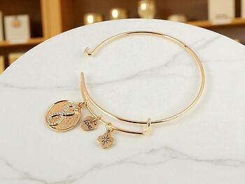 Goldtone bangle style bracelet featuring a large infinity charm as well as three smaller charms, one stamped with the word love. Bracelet has a 2 1/2 inch diameter. This bracelet is perfect for yourself or for gift giving.