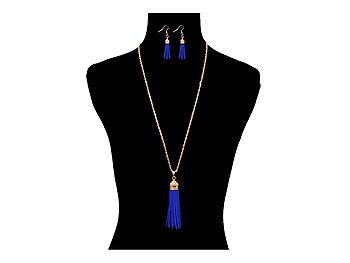 Suede Tassel Long Goldtone Chain Necklace Set. Designer style 30" goldtone necklace set with suede tassel charm and matching earrings. This set is perfect for yourself or for gift giving.