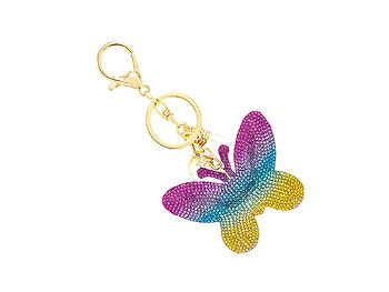 Rainbow Butterfly Tassel Bling Faux Suede Stuffed Pillow Key Chain Handbag Charm. Perfect bling accessory to decorate your keys or your handbag! This stuffed pillow butterfly keychain measures 3.25" x 2.5" and is adorned with pave crystal stones and comes with a claw hook. This will definitely stand out and show your fun personality. It is perfect for yourself or for gift giving.