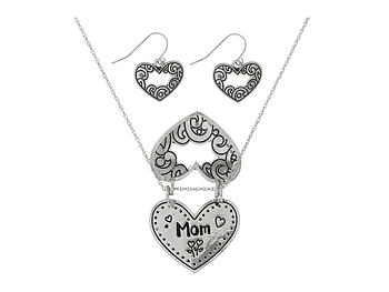 Dainty necklace set with a heart locket pendant stamped with "Mom" and matching fishhook earrings. Approximately 16" in length with a pendant Size of 1.5" long x 1" wide. This necklace set will make a great gift for any mother. Get yours today!