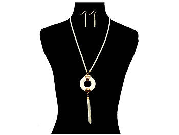 White and Goldtone Circle Drop Tassel Long Necklace & Earring Set
